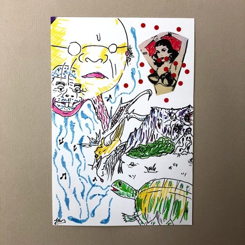 根本敬のお馴染みキャラクターを中心にドローイングが描かれたとてもカワイイ作品。