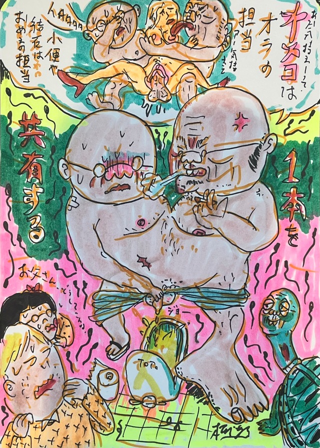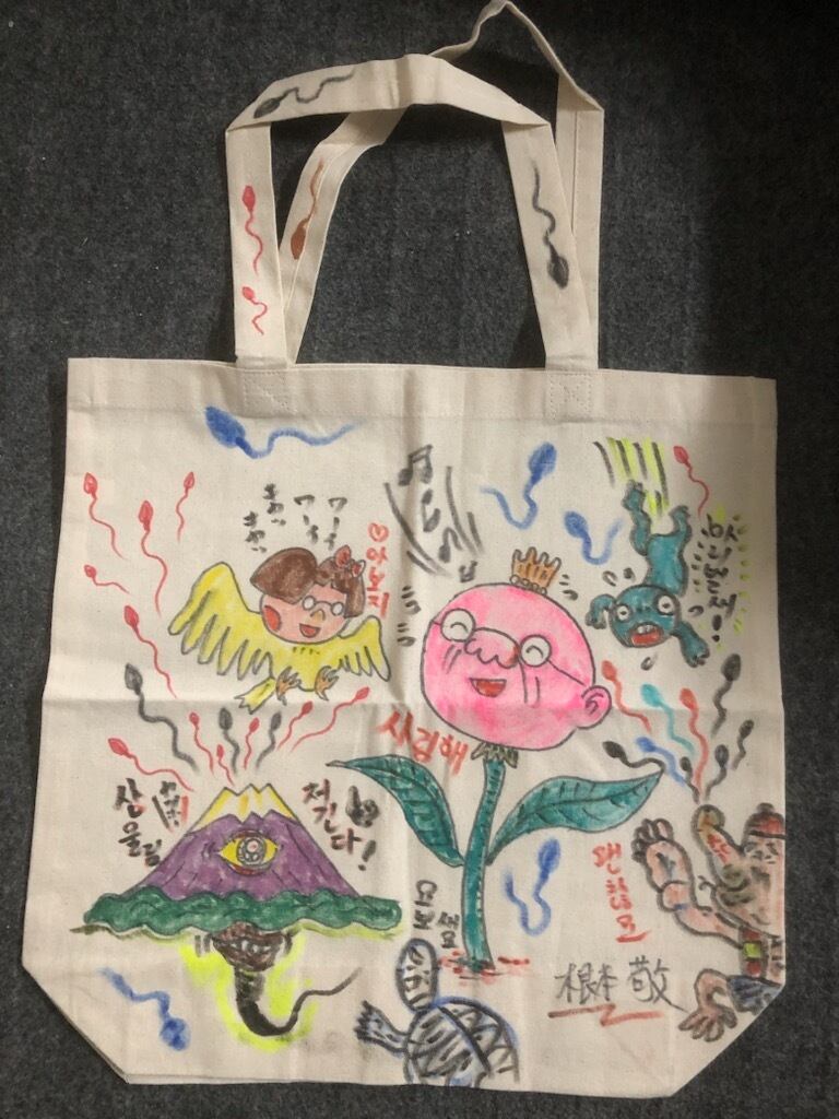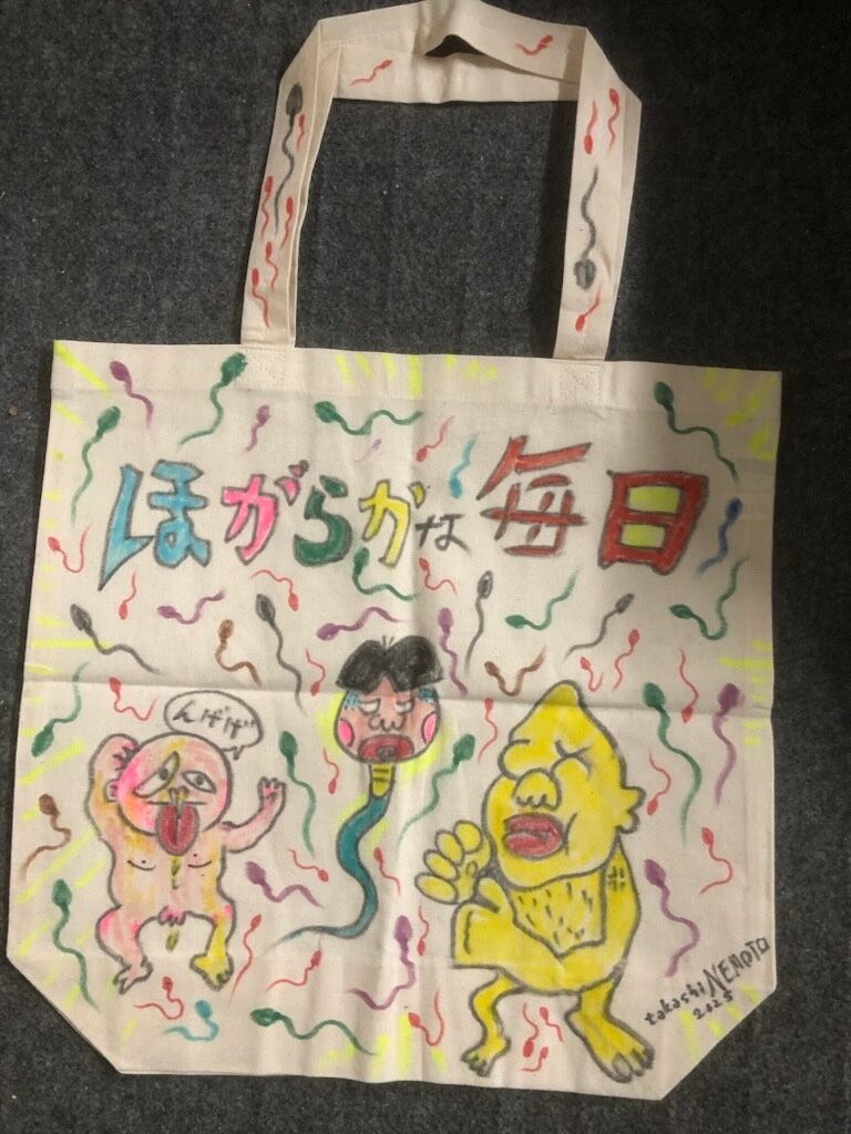 根本敬手描きの一点物トートバッグ。 両面にイラスト入りです。 素材は薄手のキャンバス生地 ※メッセージカードをつけて発送いたします。