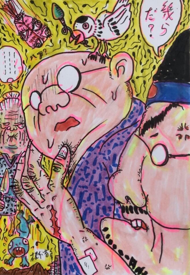 原画・着色ドローイング 「幾らだ?」(ハテ、何を??)※傍らで宙に浮かんだお婆ちゃんが手に包丁を握り佐吉に向かう機会を伺っているかの様だ) 原画 サイズ:B6