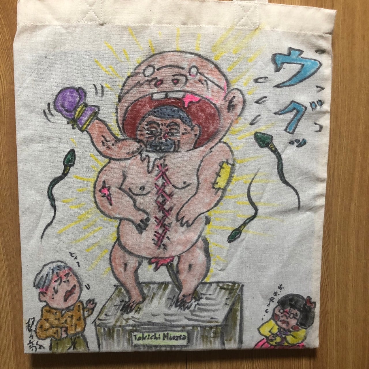 薄手のキャンバス生地に描かれた1点ものトートバッグ 両A面トートバッグ LPレコード1枚のサイズ 「天然/ウグッ」 無地のキャンバスに 油性ペンで線を描き、布用水性顔料ペンで着色しました。 大きさ ちょうどレコード1枚はいるかな、というさいずです。 素材 キャンバス生地(うすめ) 布用インク