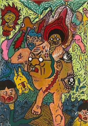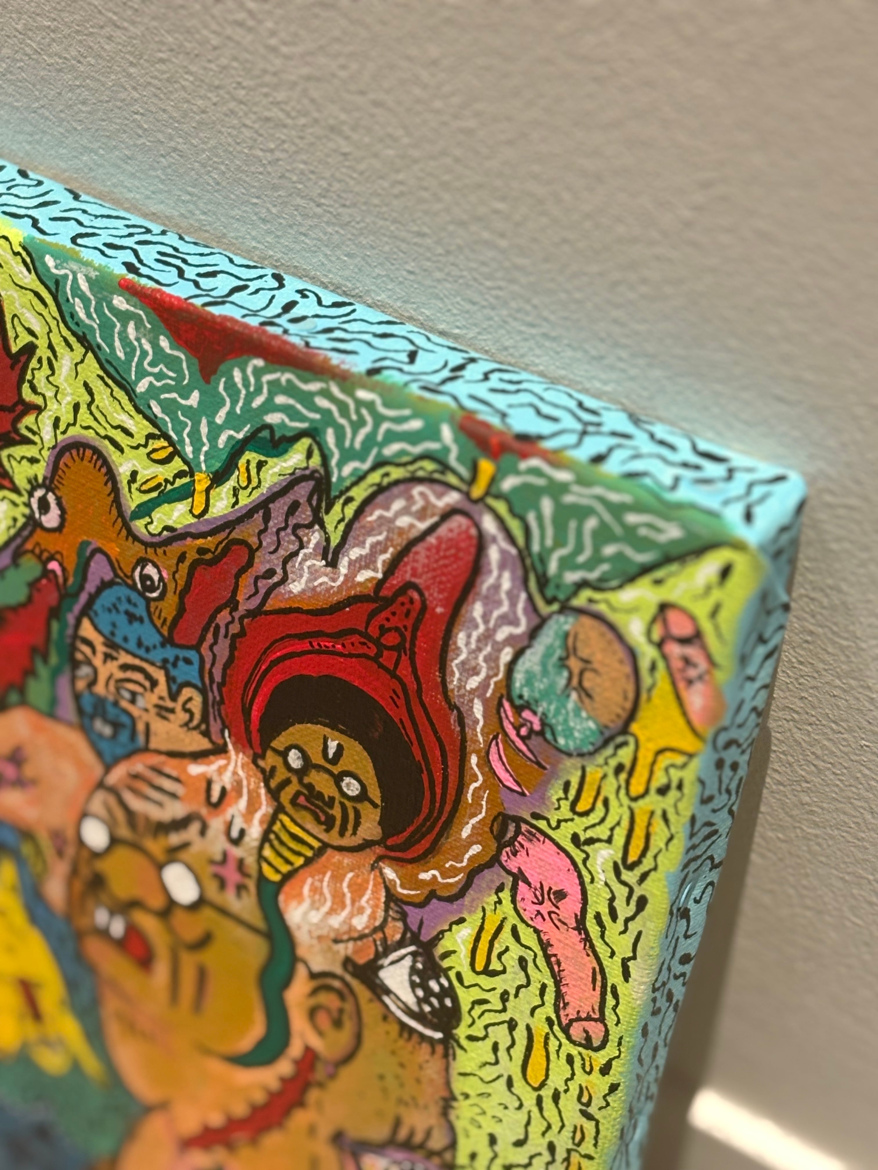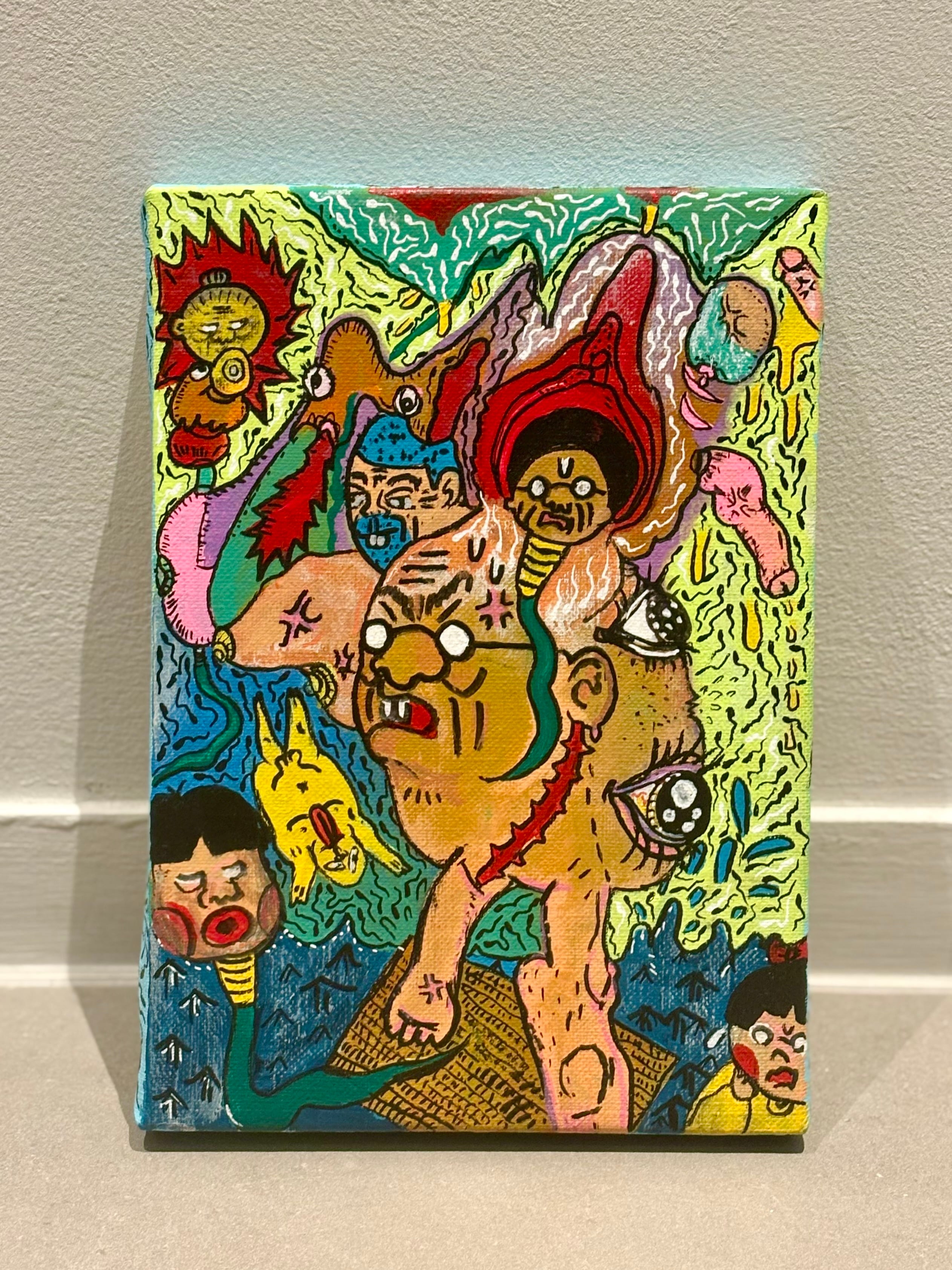 絵柄は過去のB6ドローイングより「部屋に飾れる」(根本敬作風比)ものを227㎜×158㎜のキャンバスに描きました。