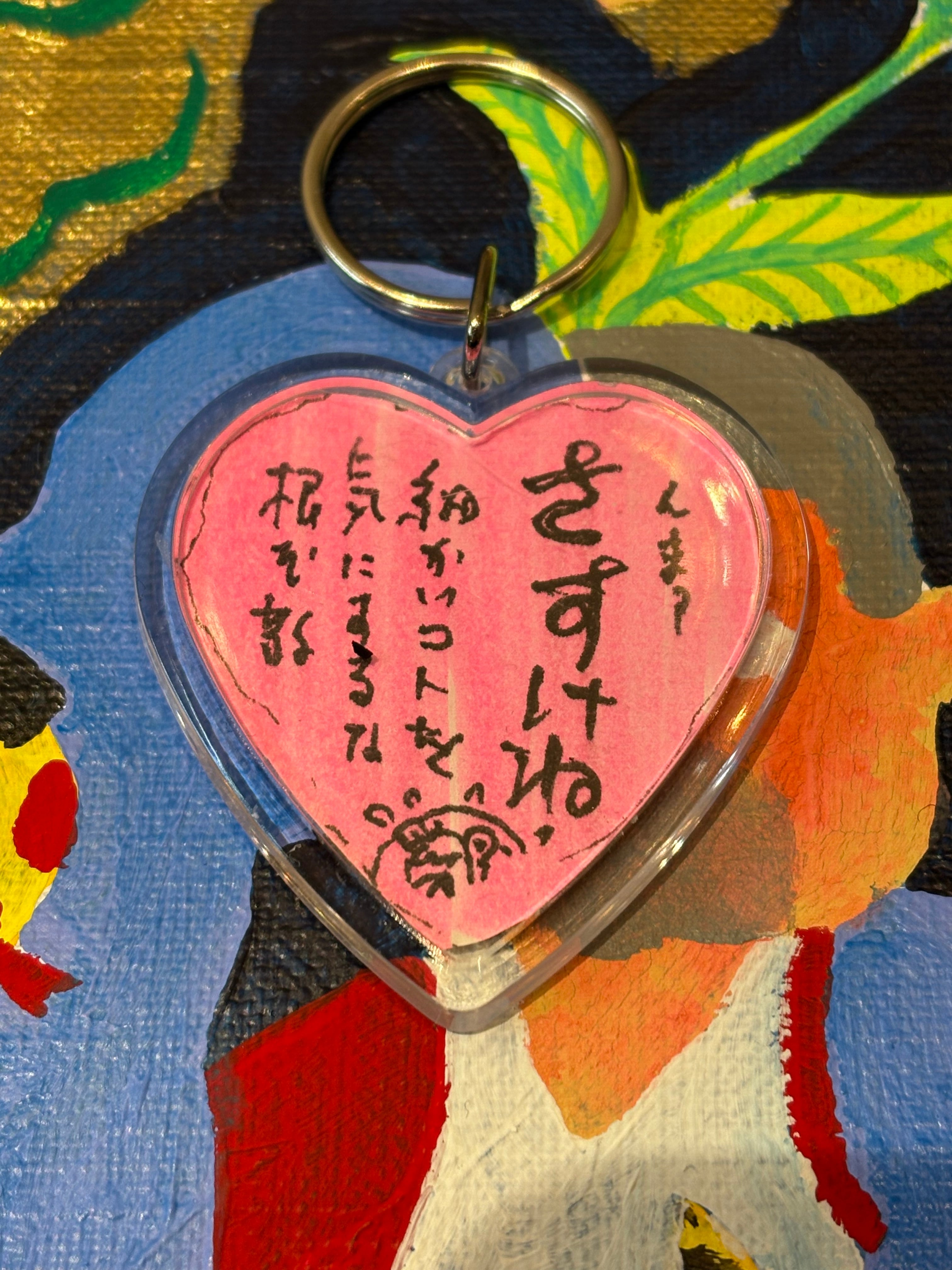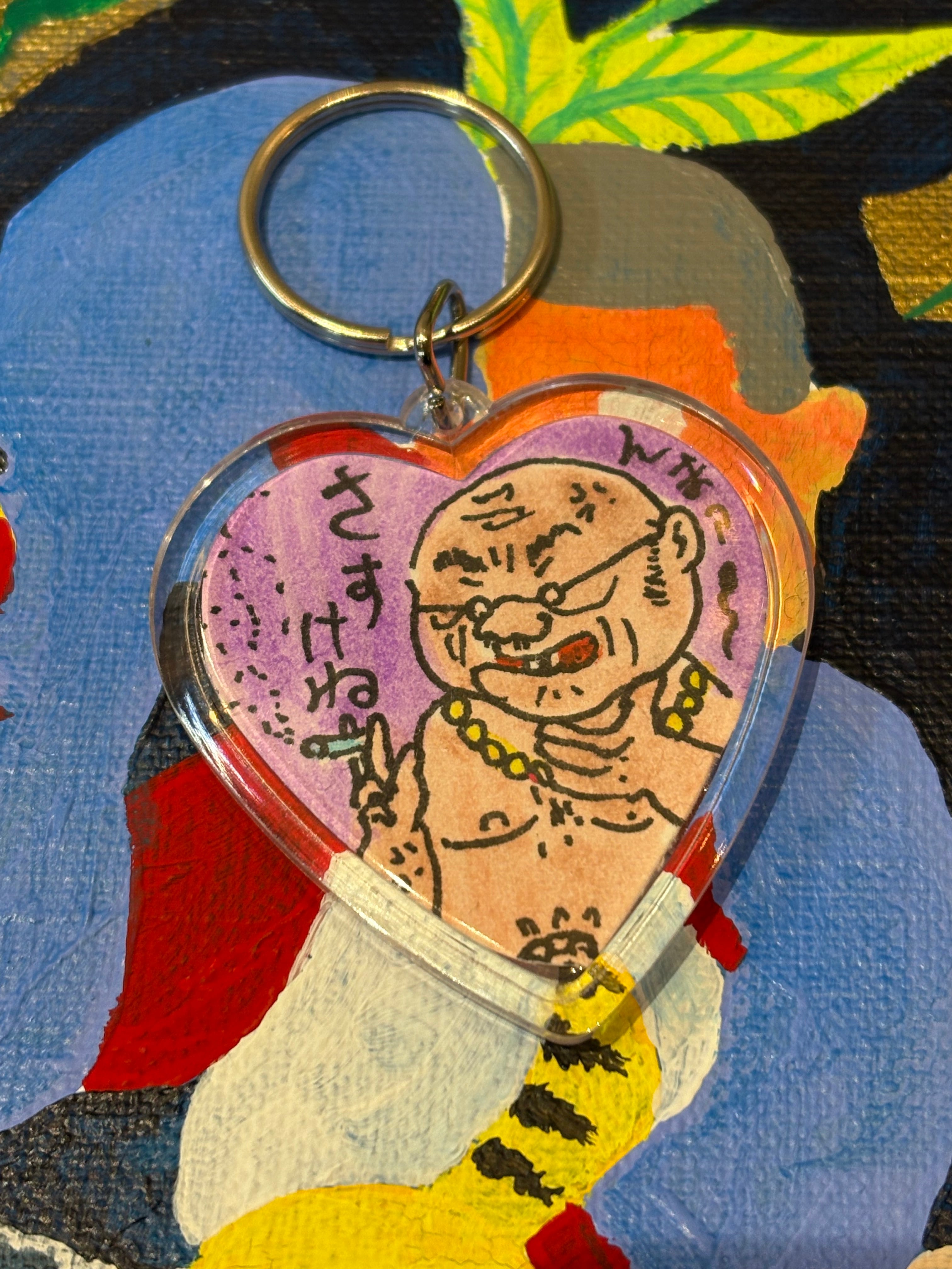 ハート型キーホルダー 中身は1枚1枚手描きのイラスト1点物キーホルダーです。 裏面にはサイン入り。 サイズ キーホルダー部分5cm 全体8cm