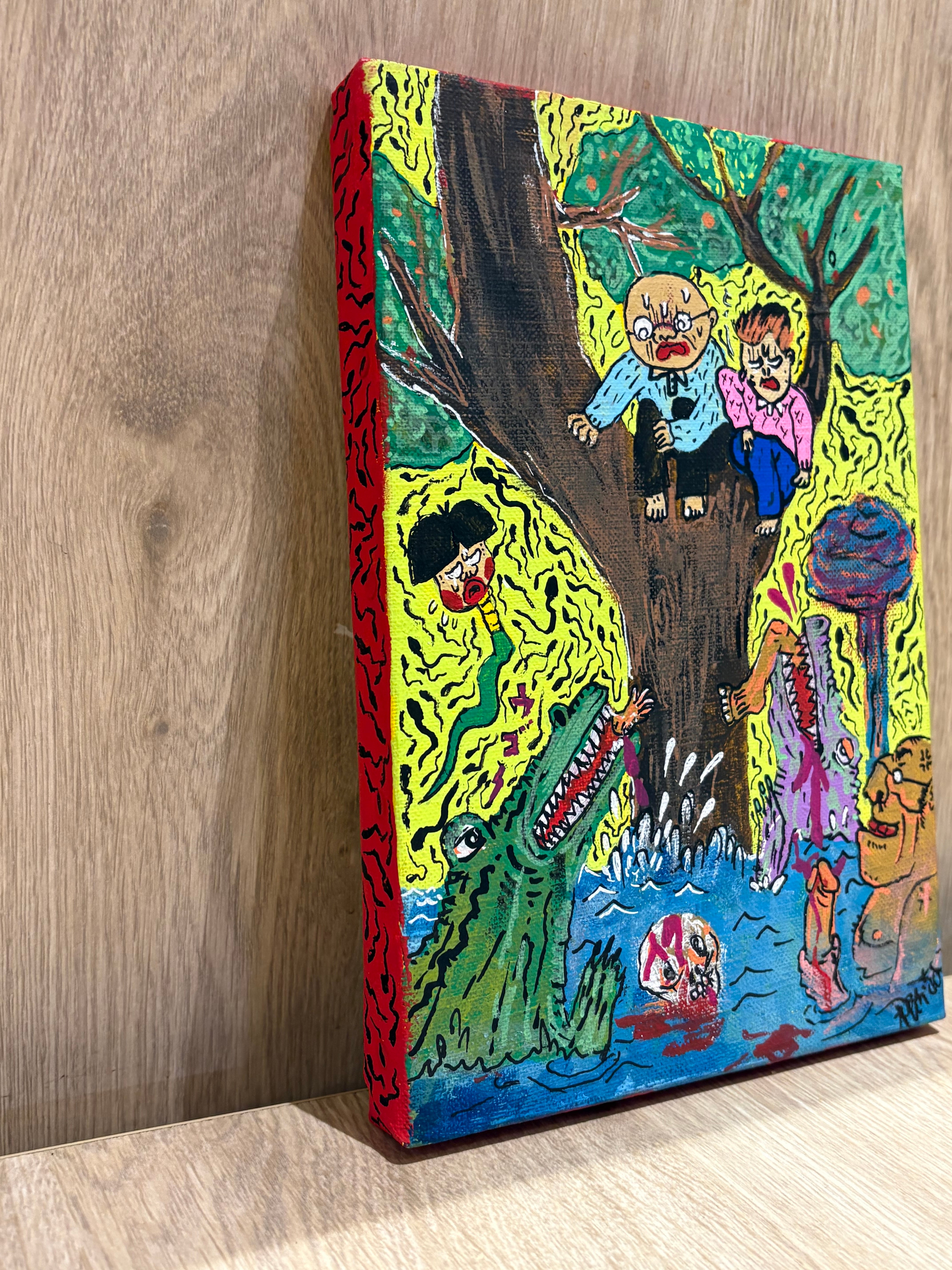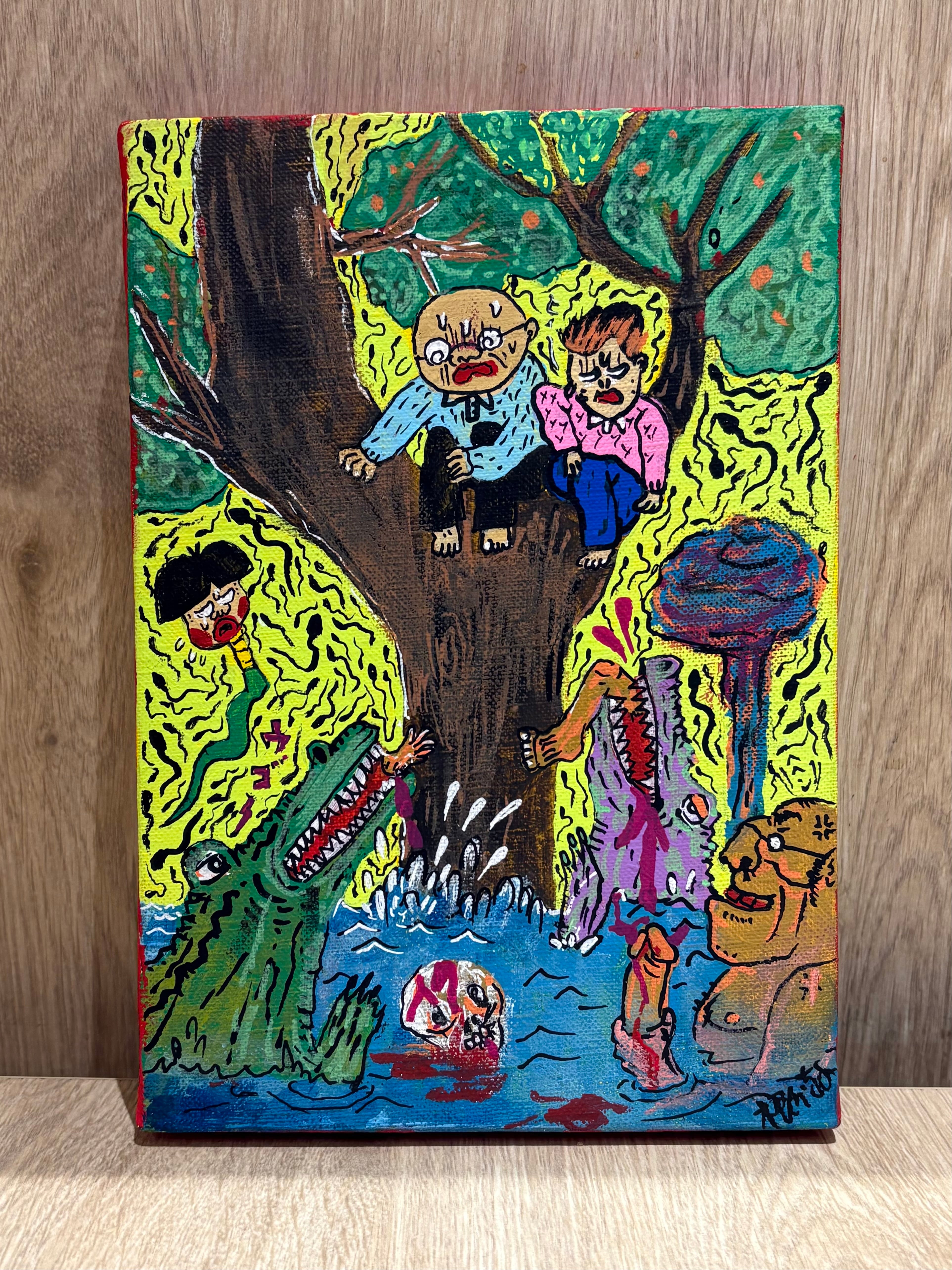 絵柄は過去のB6ドローイングより「部屋に飾れる」(根本敬作風比)ものを227㎜×158㎜のキャンバスに描きました。