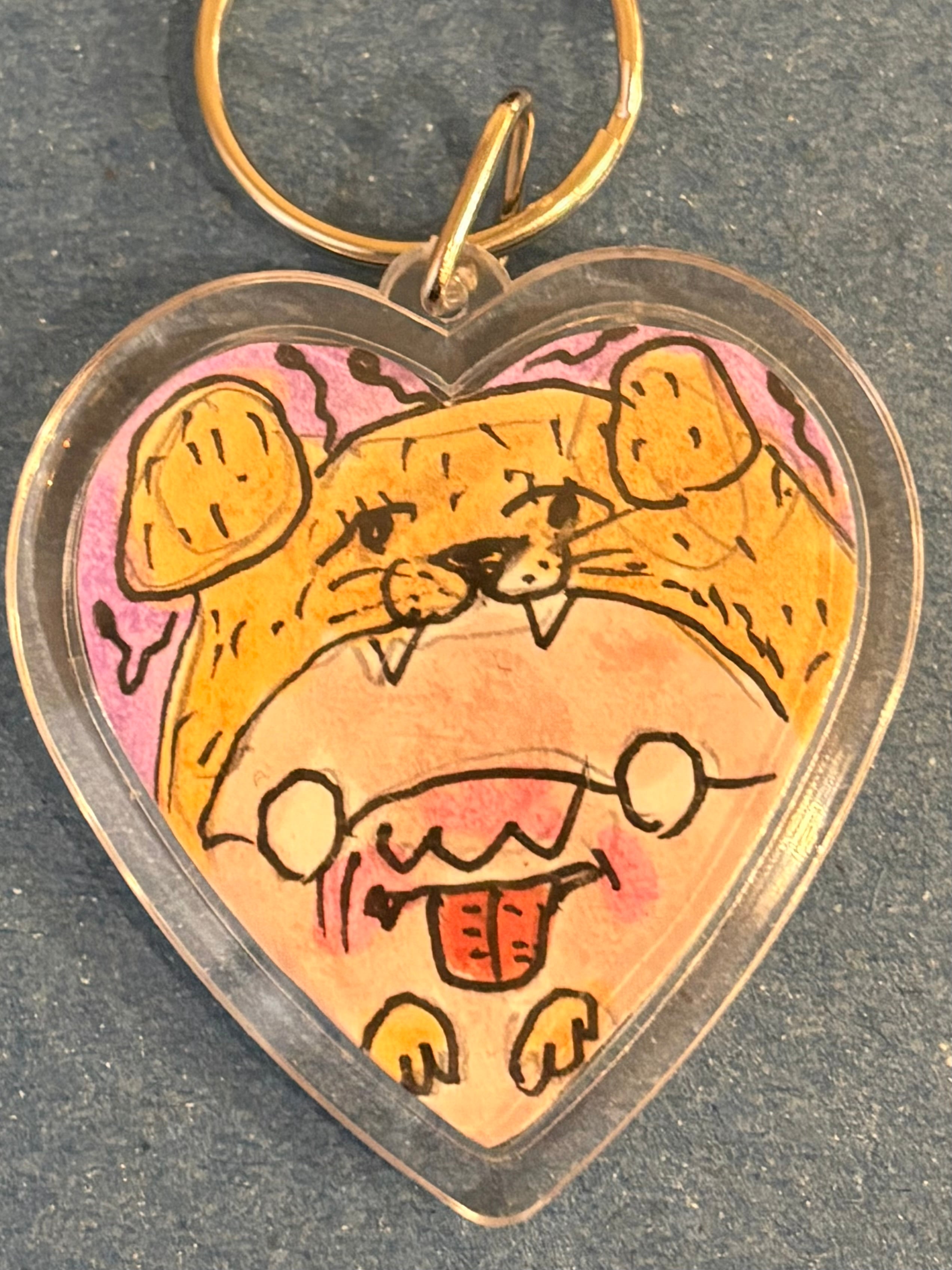 ハート型キーホルダー 中身は1枚1枚手描きのイラスト1点物キーホルダーです。 裏面にはサイン入り。 サイズ キーホルダー部分5cm 全体8cm