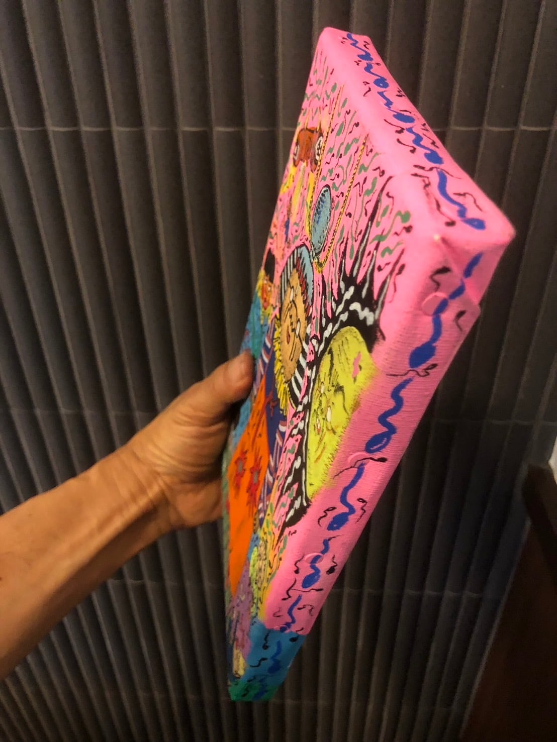 絵柄は過去のB6ドローイングより「部屋に飾れる」(根本敬作風比)ものを227㎜×158㎜のキャンバスに描きました。