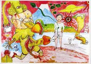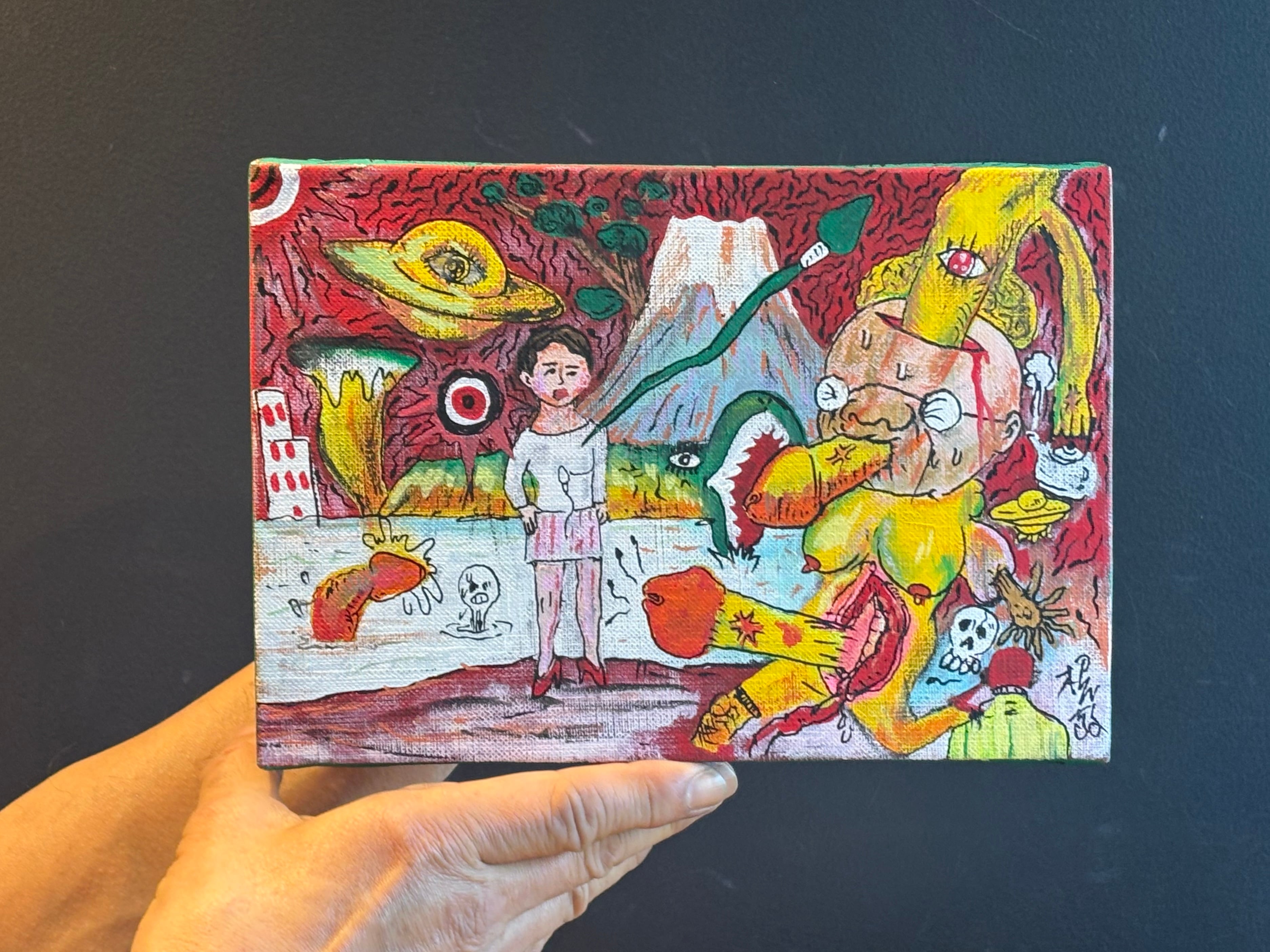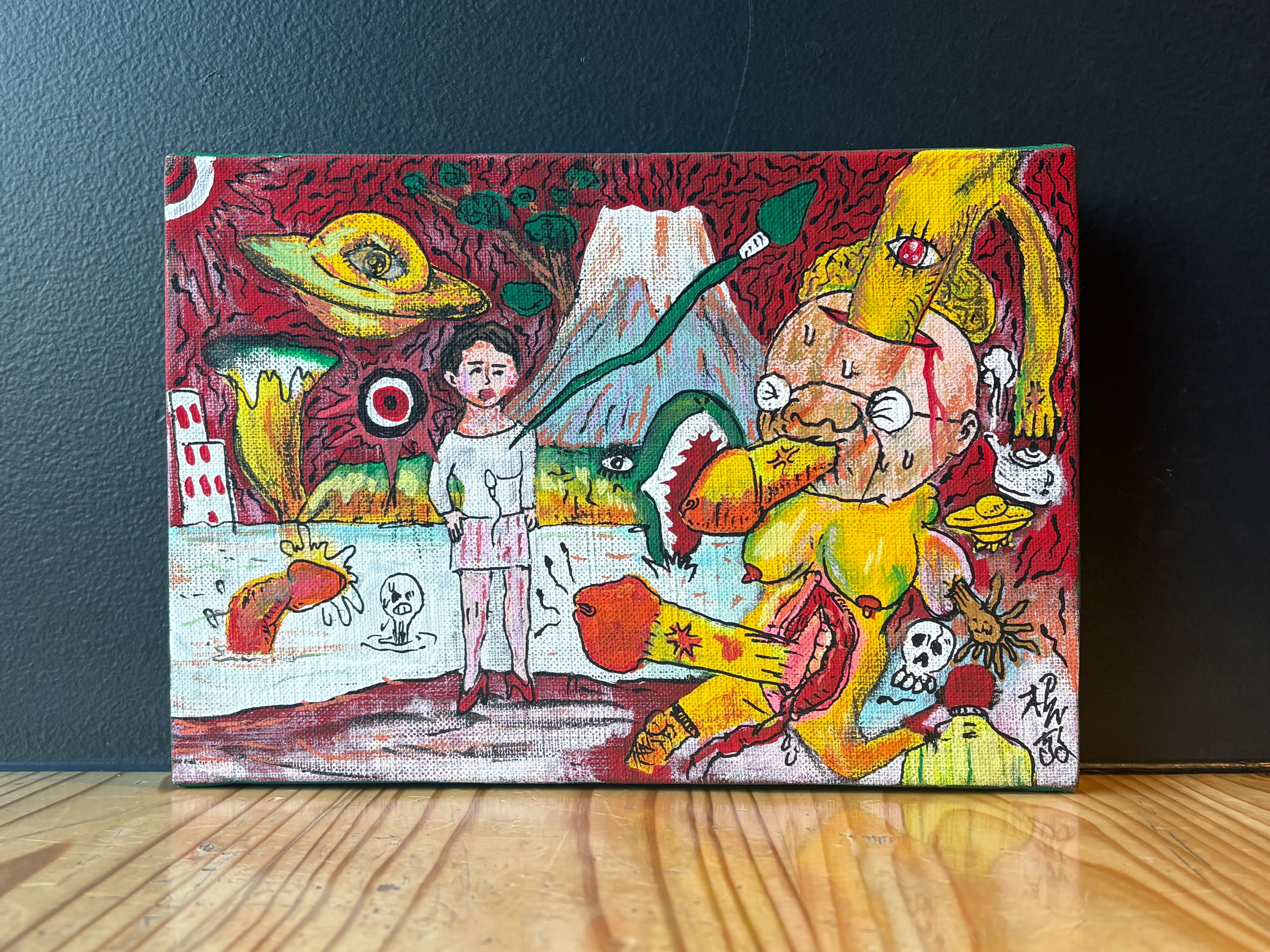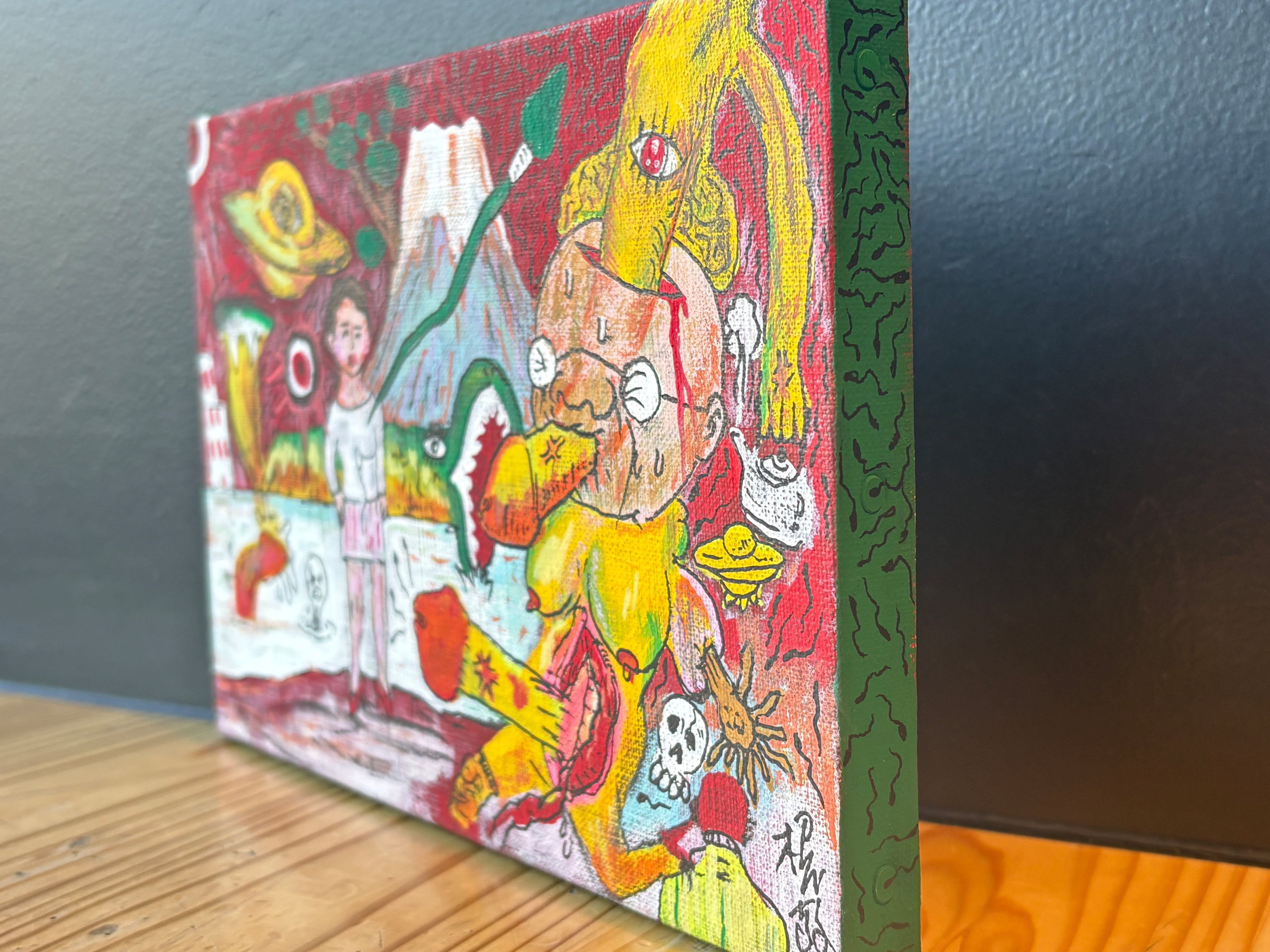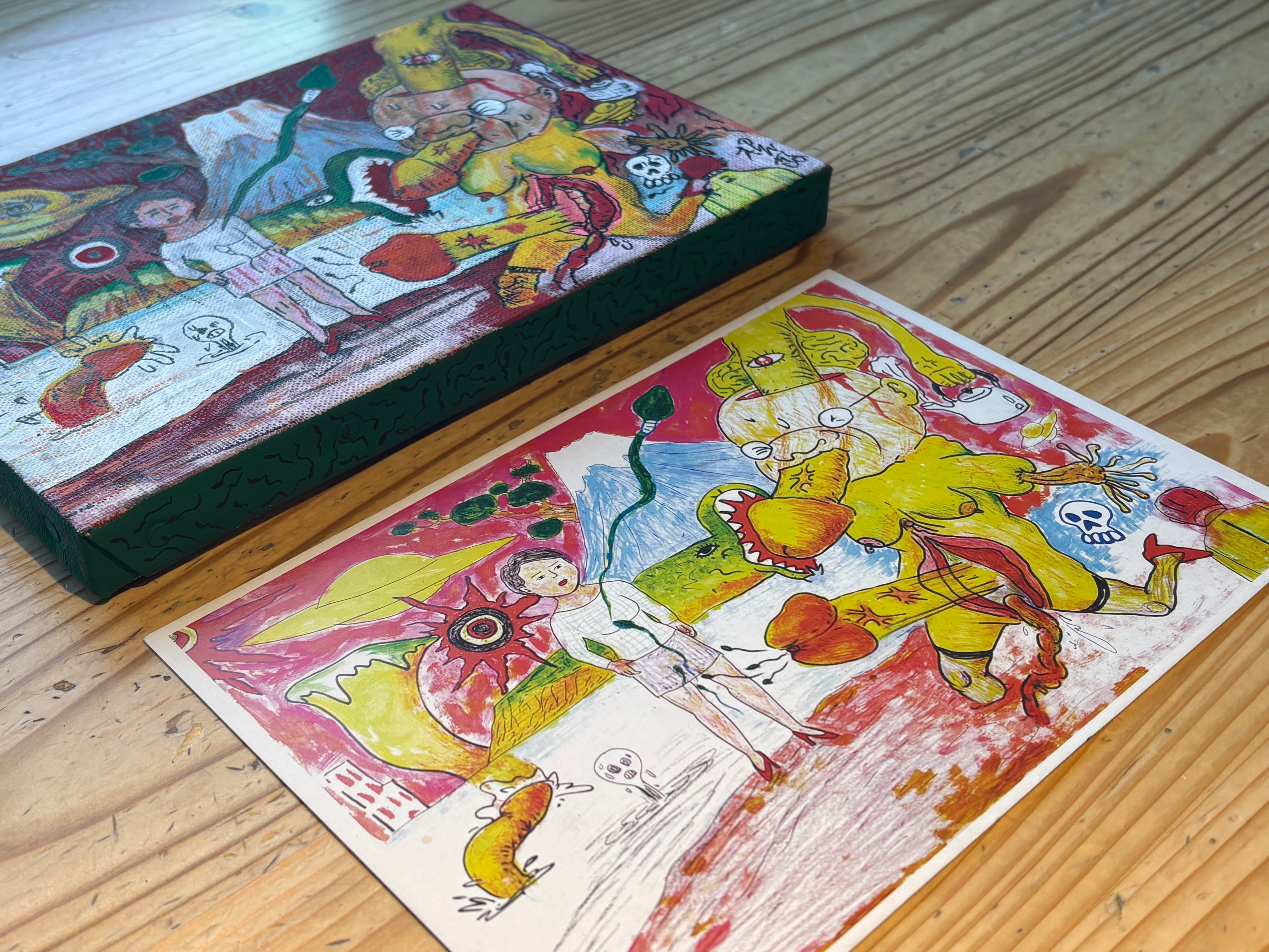 絵柄は過去のB6ドローイングより「部屋に飾れる」(根本敬作風比)ものを227㎜×158㎜のキャンバスに描きました。