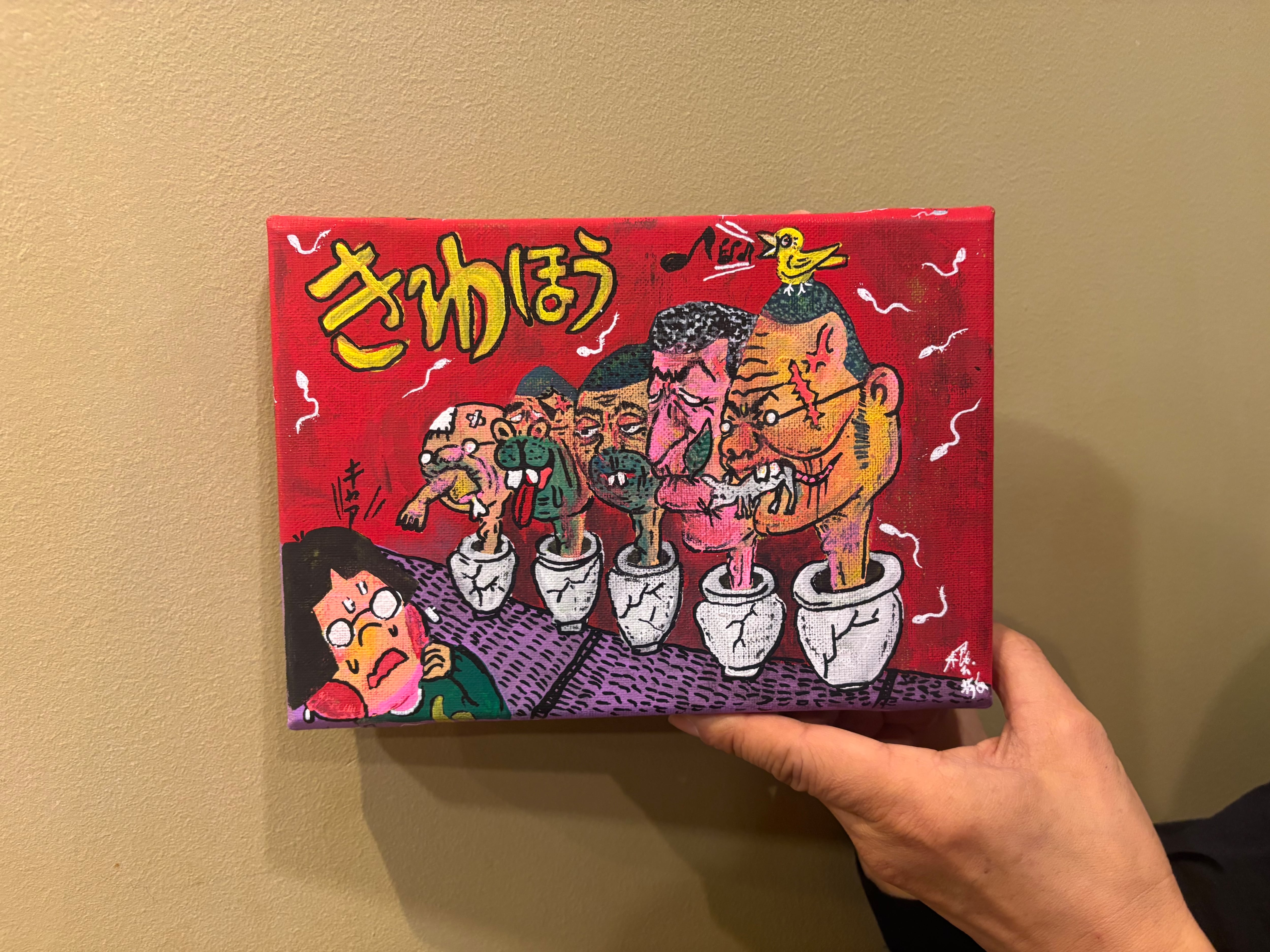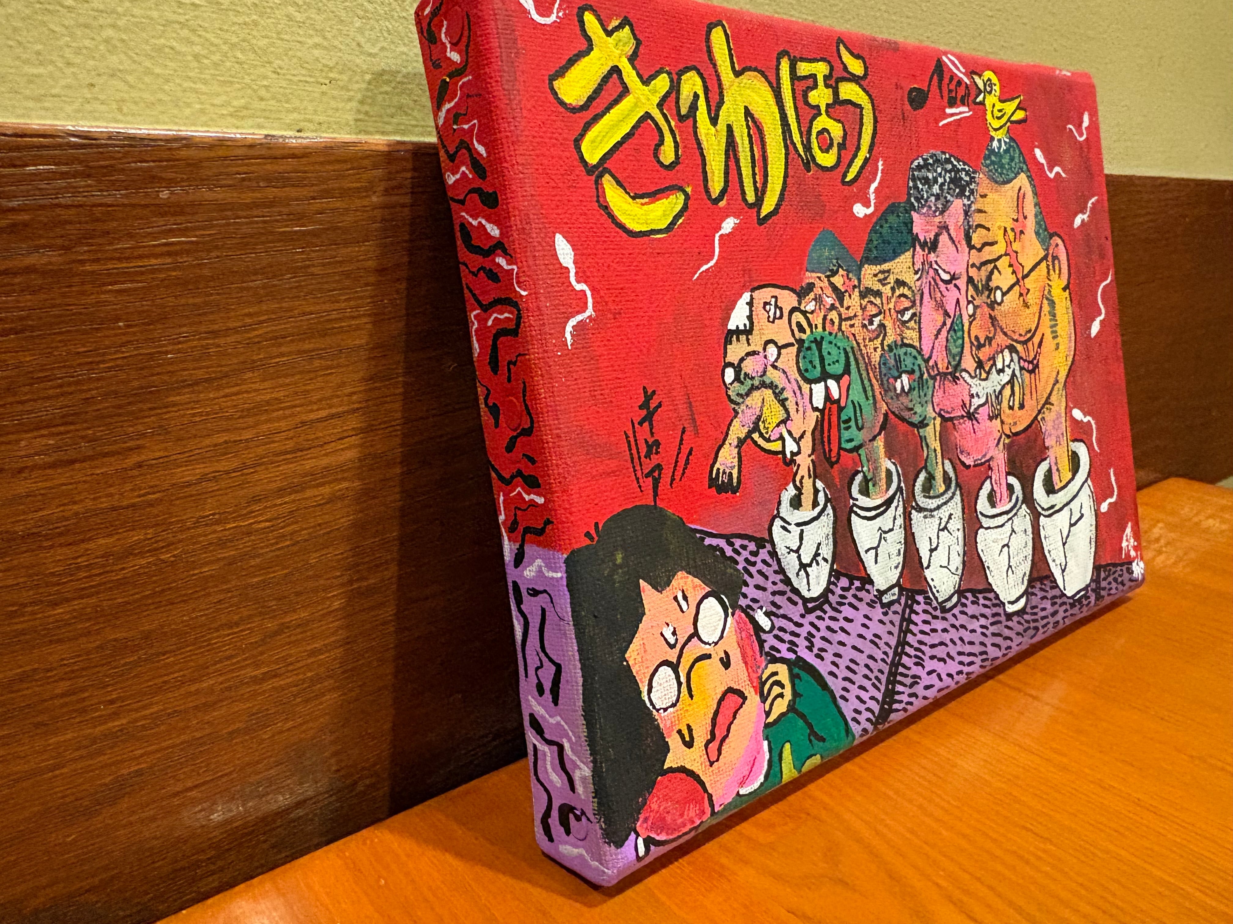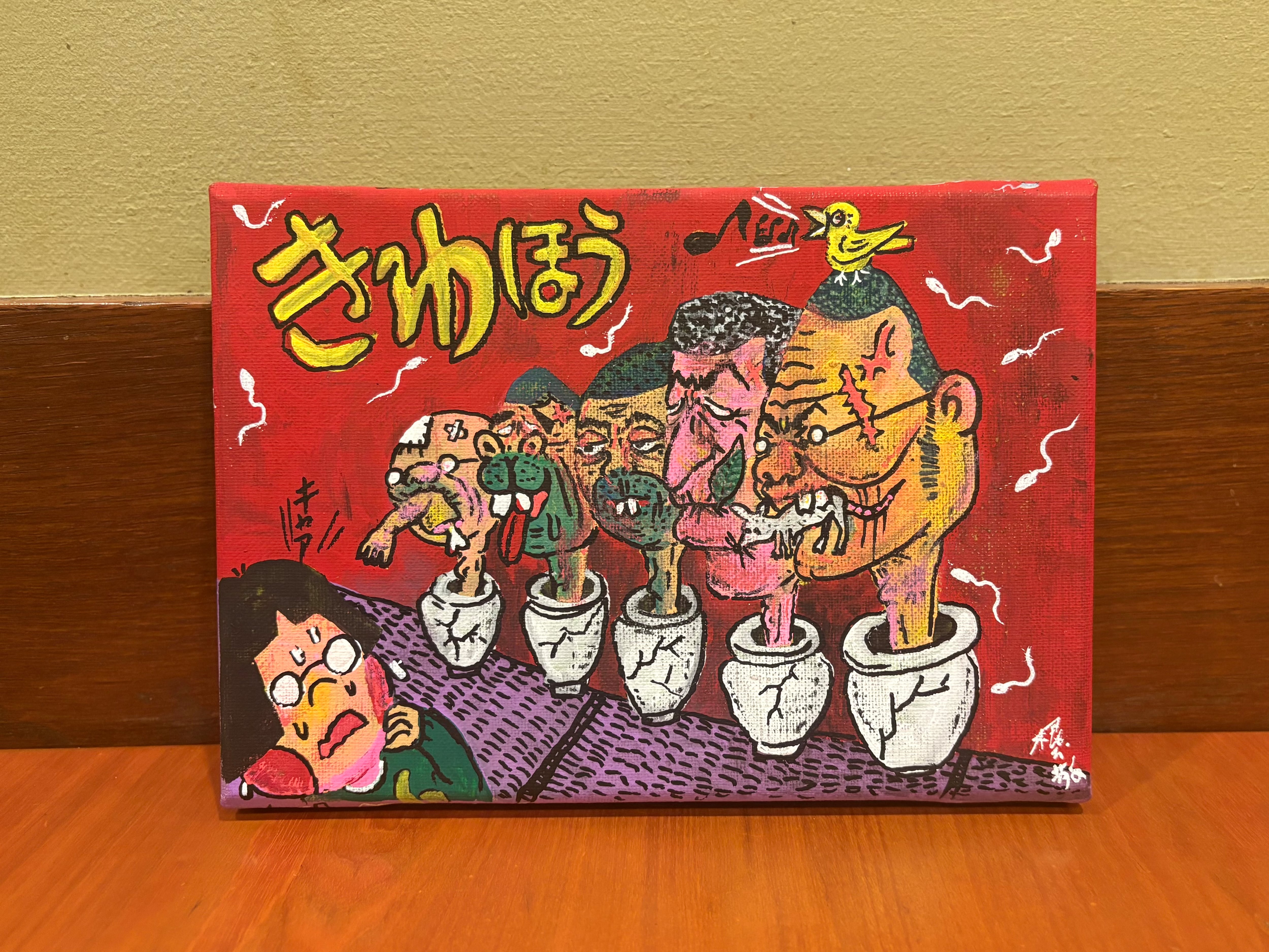 絵柄は過去のB6ドローイングより「部屋に飾れる」(根本敬作風比)ものを227㎜×158㎜のキャンバスに描きました。