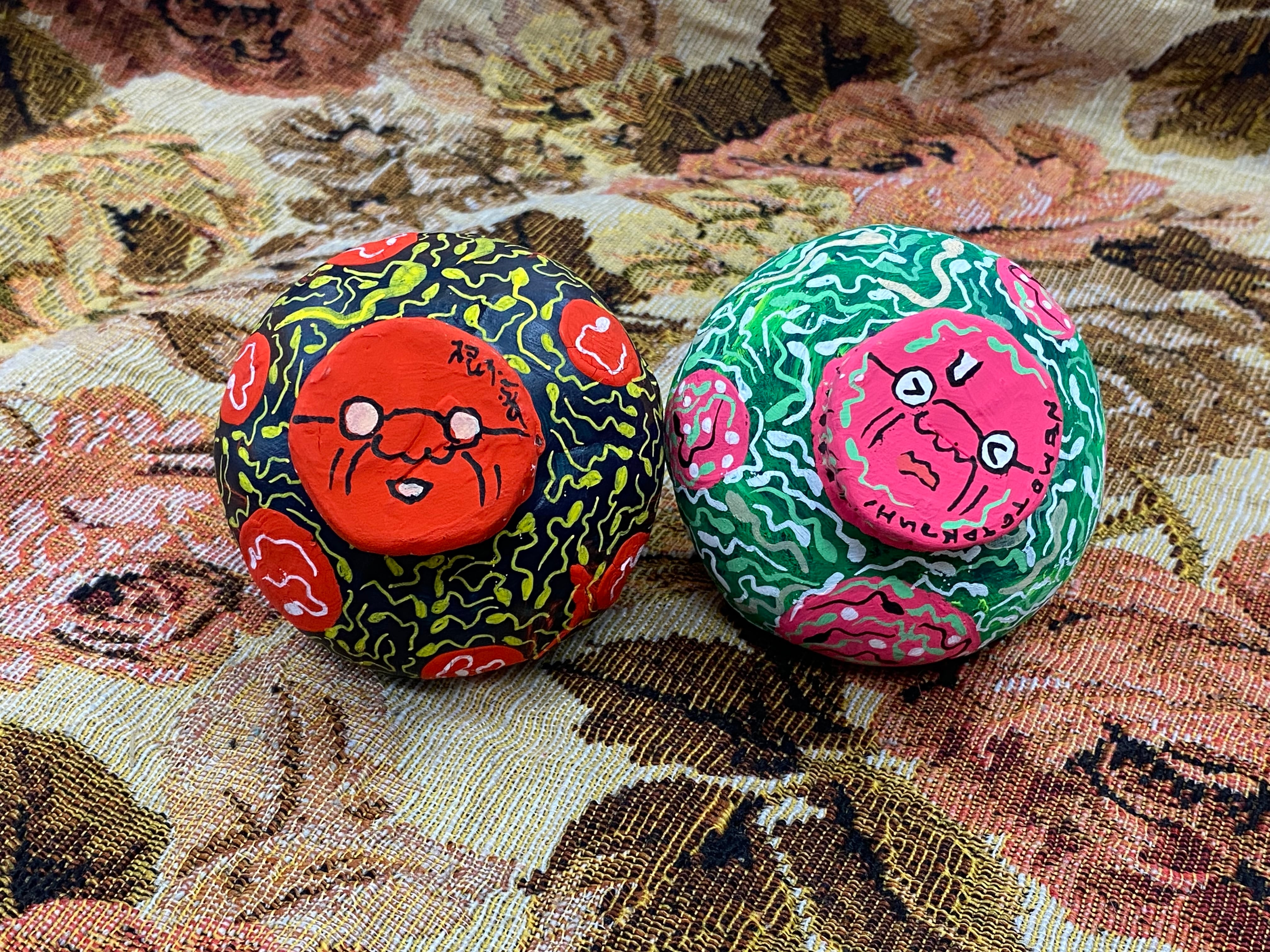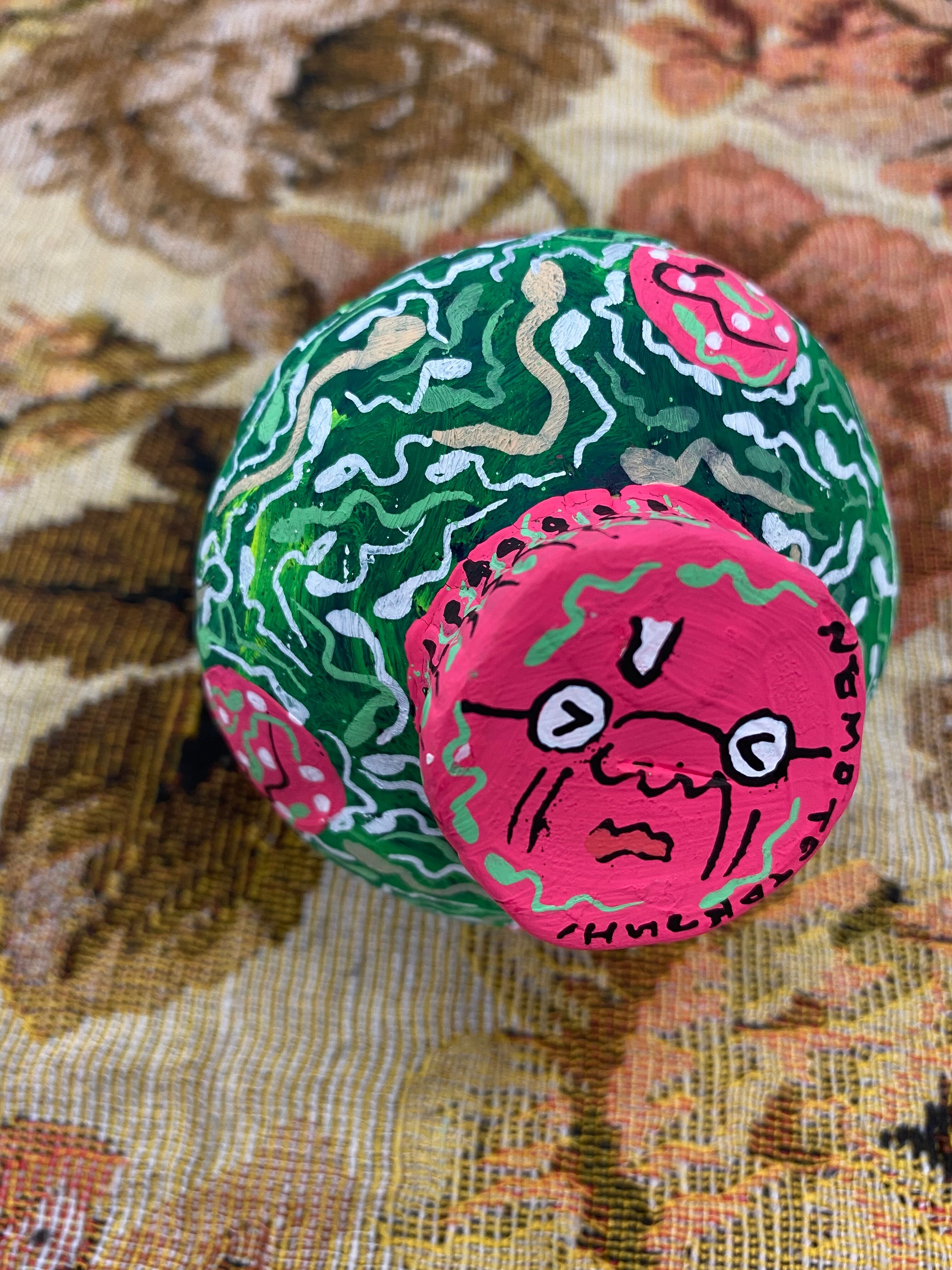 初めてのキノコモです。 1匹1匹手描きで描かれた精子の毒キノコです。 飾ってもらえるように、表面にはキャラクターは描かれていませんが、底の部分にサインと村田の顔が描かれた、とてもかわいい一品です。 【材質】 陶器 アクリル絵の具 ニスで定着仕上げ