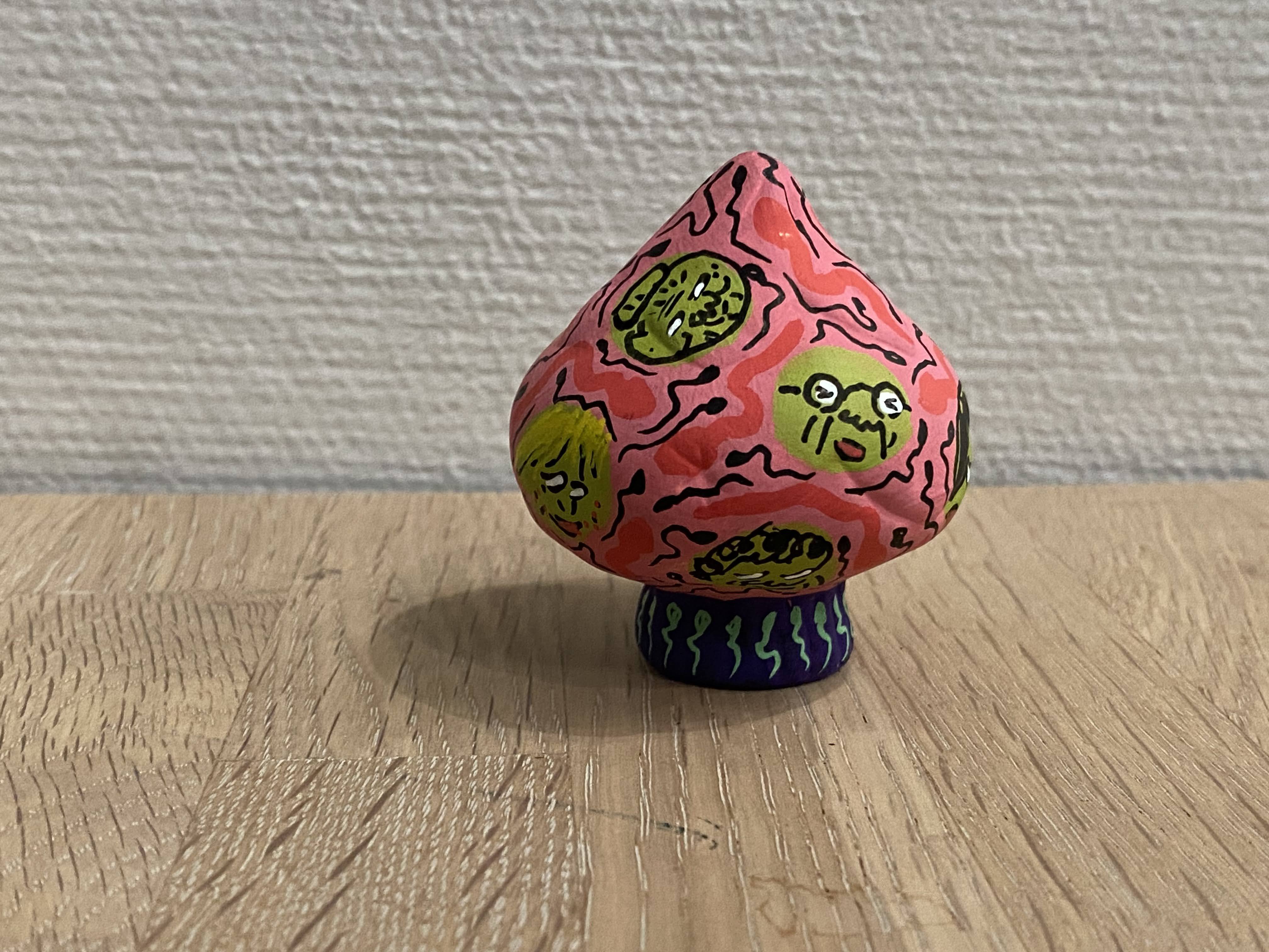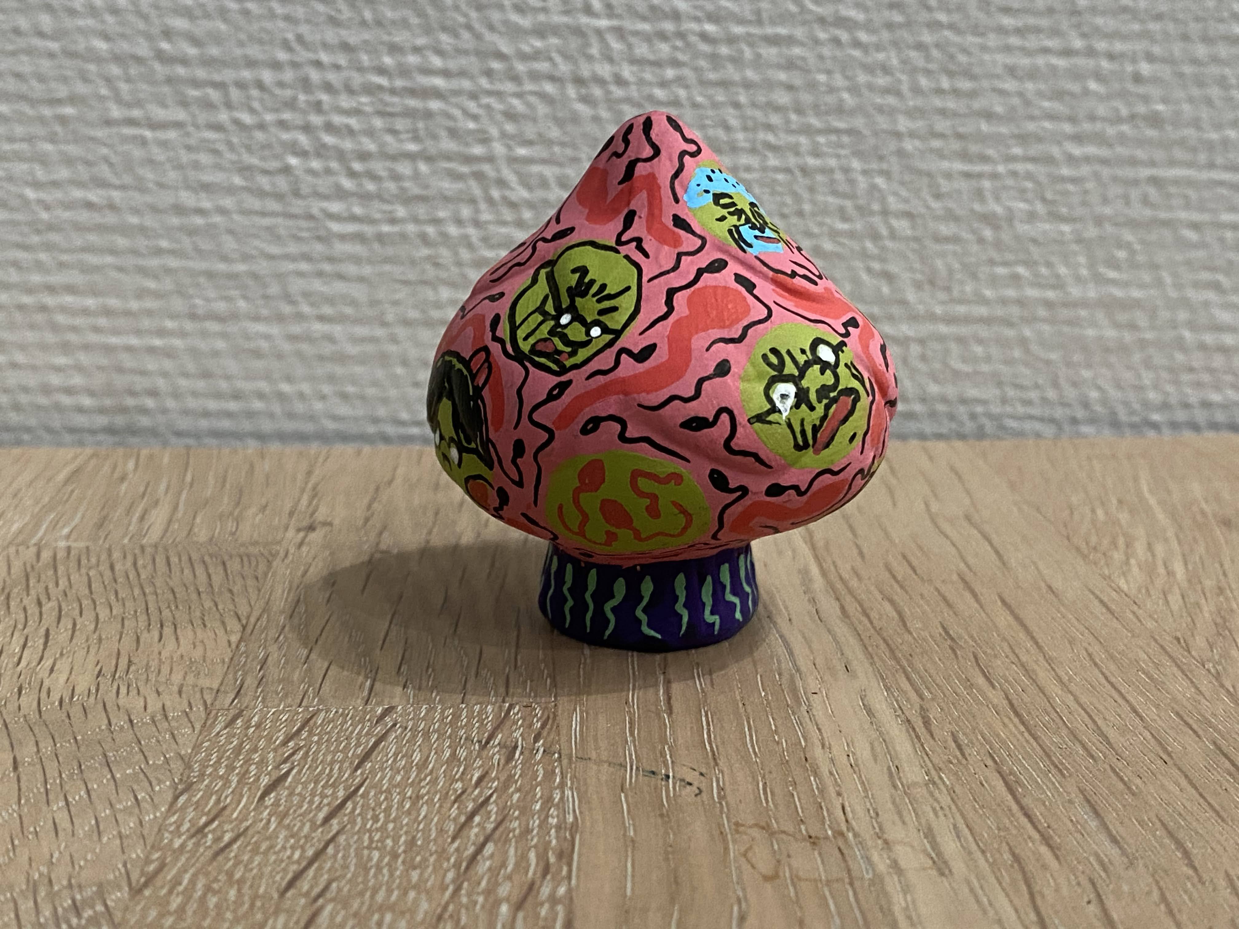 ドットに村田家族入り。 1匹1匹手描きで描かれた精子の毒キノコです。 底の部分にサインと村田の顔が描かれた、とてもかわいい一品です。 【材質】 陶器 アクリル絵の具 ニスで定着仕上げ