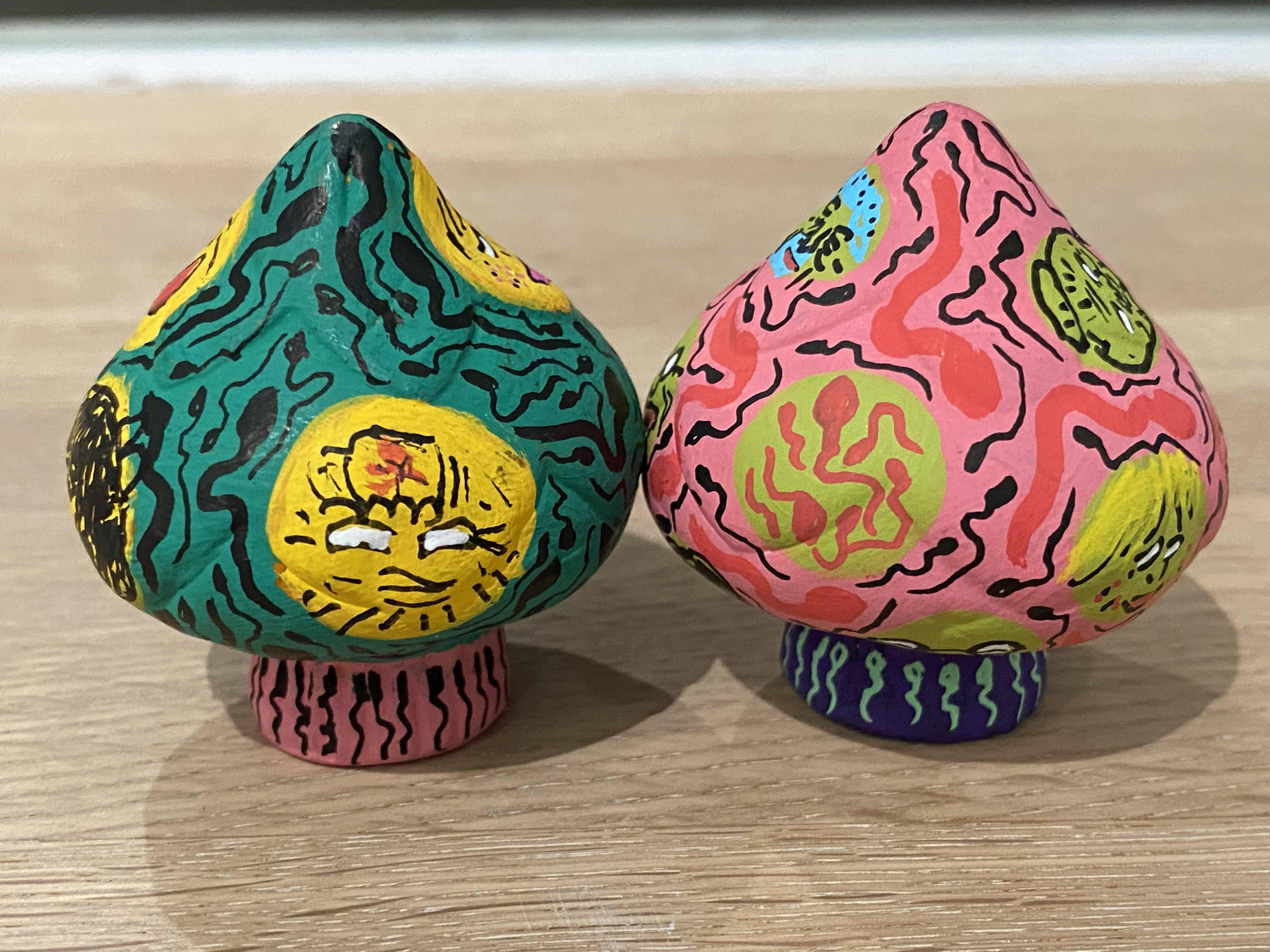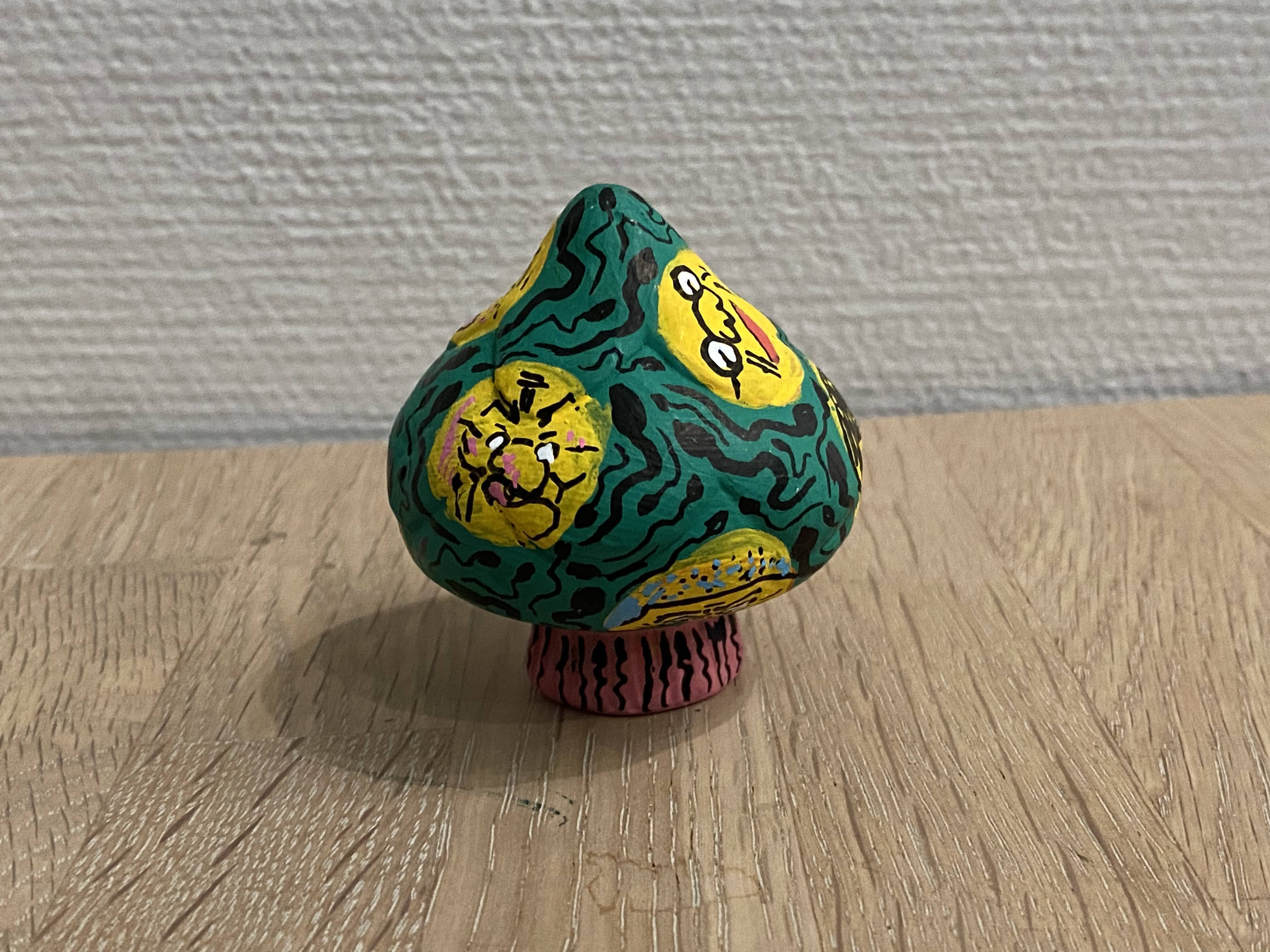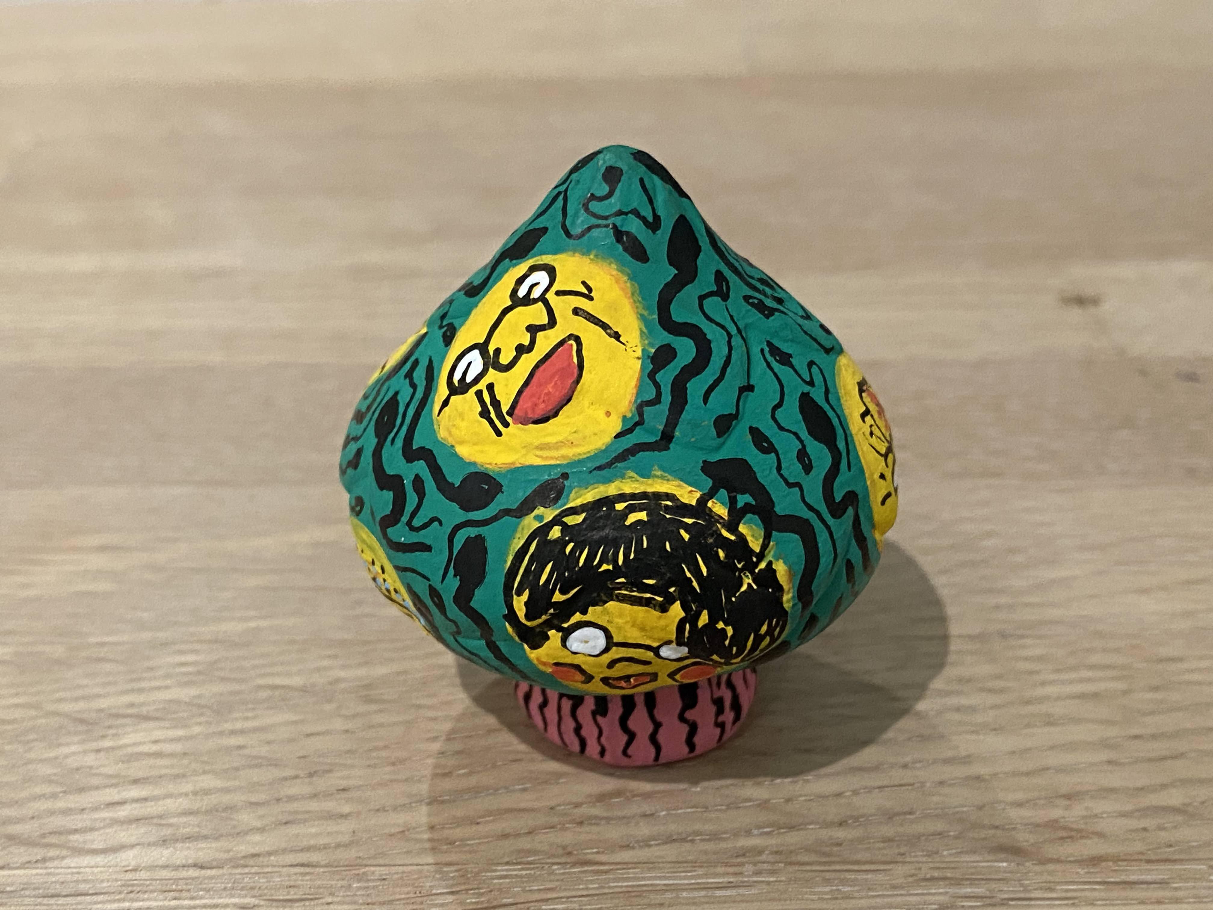 ドットに村田家族入り。 1匹1匹手描きで描かれた精子の毒キノコです。 底の部分にサインと村田の顔が描かれた、とてもかわいい一品です。 【材質】 陶器 アクリル絵の具 ニスで定着仕上げ