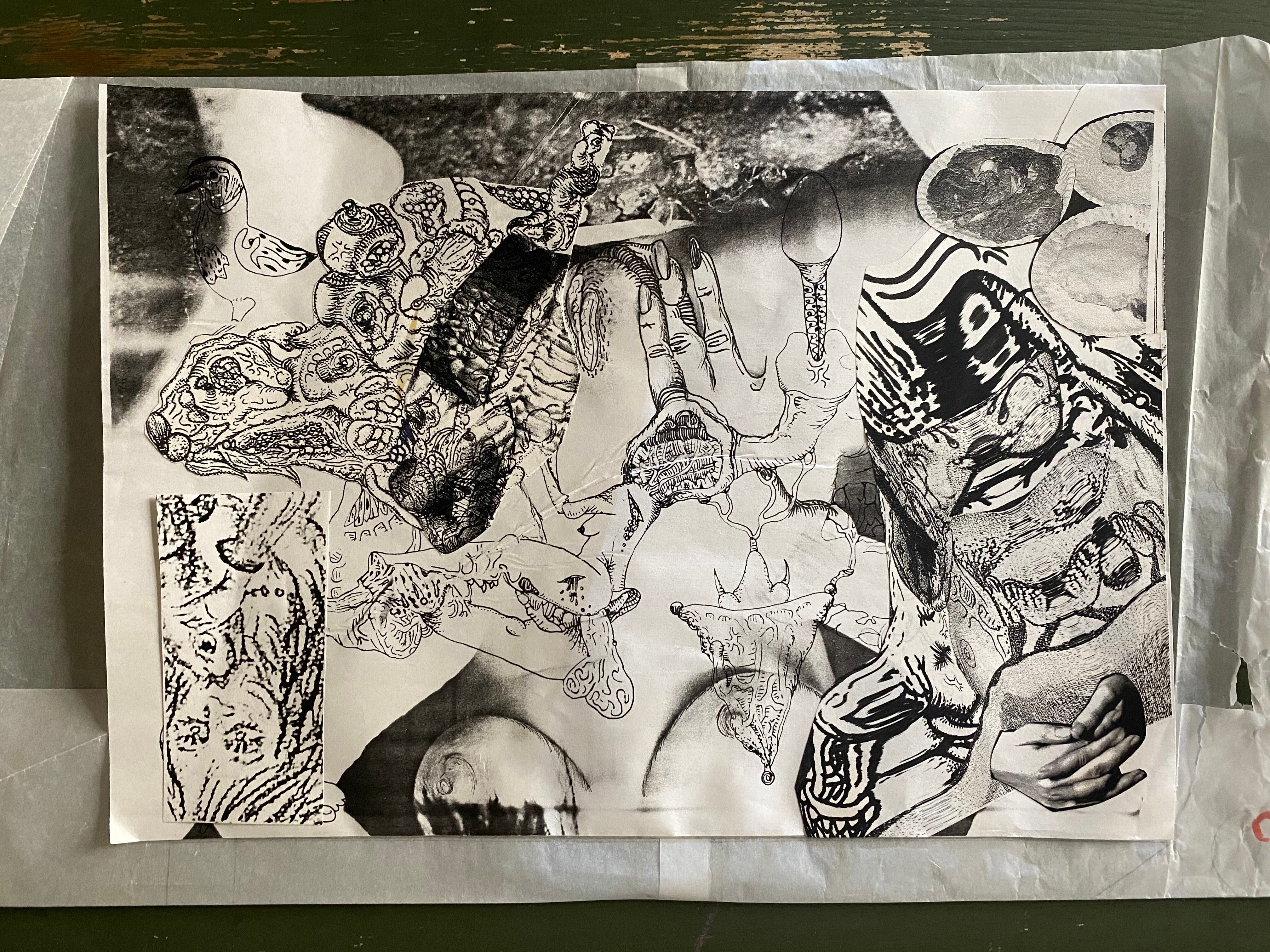 佐川一政著「無法松の一政」に百点程描いたり切り貼りした見開きイラストの手元に残ったもの。 原画・一点物 サイズ 258mm×188mm 根本さんのメッセージカード付きで発送させて頂きます。