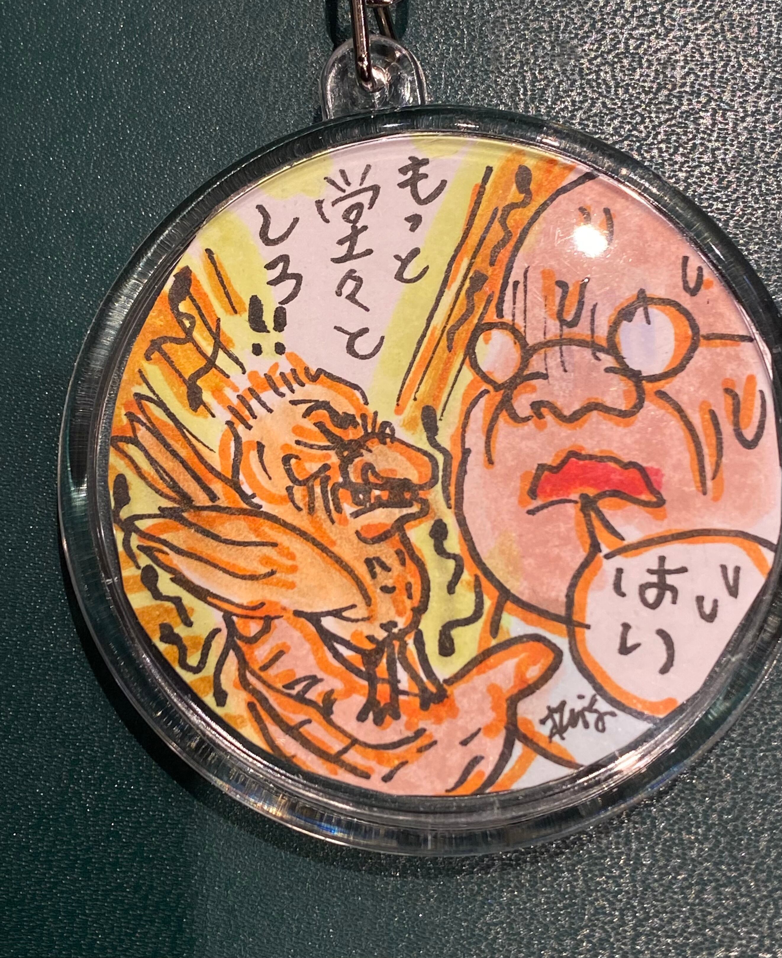 根本敬手描き着色キーホルダー 丸型 「もっと堂々としろ!」 イベントで人気の「もっと堂々としろ!」シリーズ、そして「もっとしっかりしろ!」シリーズの2種がキーホルダーになりました。 全て根本さんの手描きで手塗りです。 「身につけたり持ち歩ける商品を!」とのお客様からのご提案により新登場です。 バックにつけたり、鍵につけたり、是非毎日持ち歩いてください♪お守りのように。