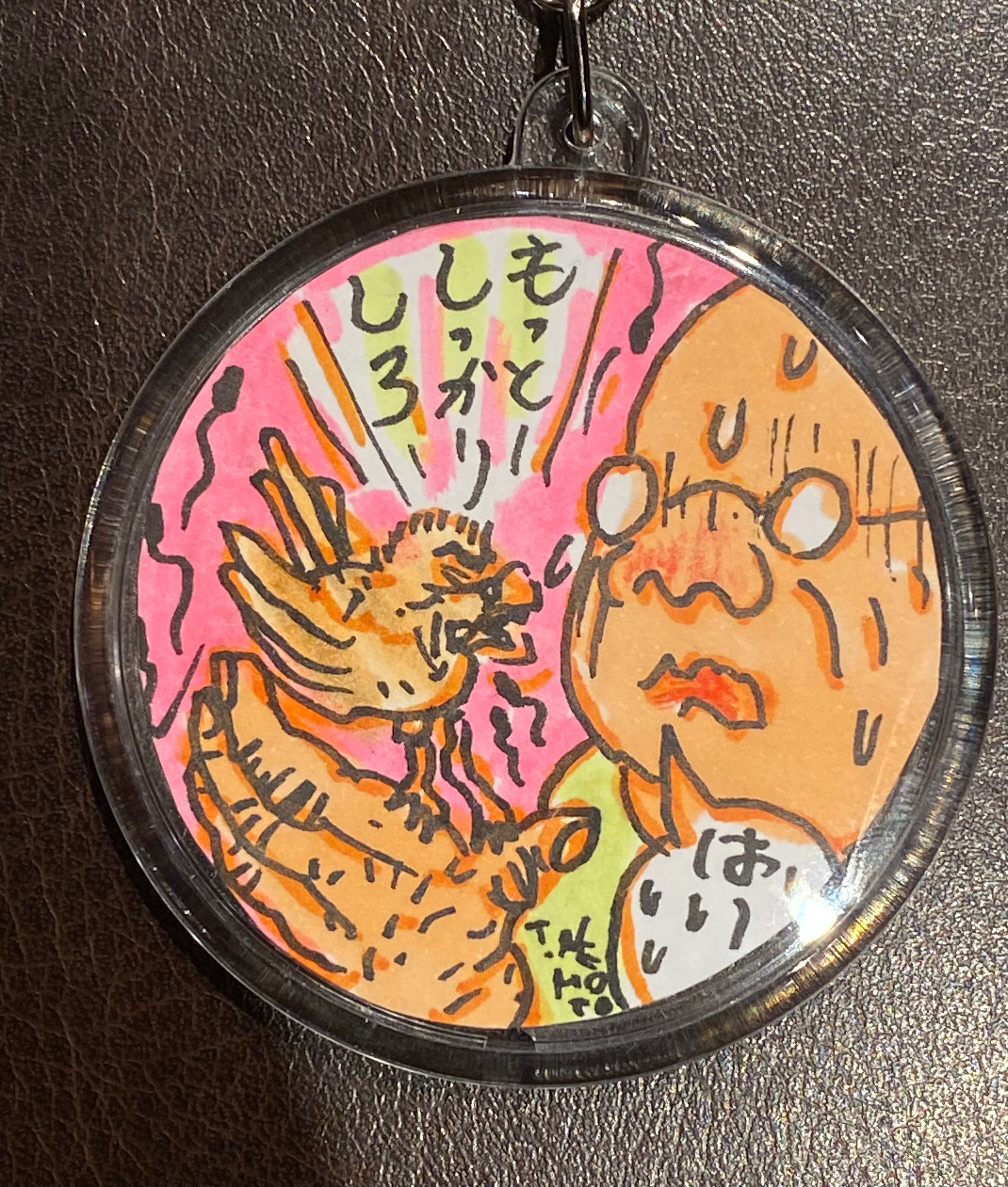 根本敬手描き着色キーホルダー 丸型 「もっとしっかりしろ!」 イベントで人気の「もっと堂々としろ!」シリーズ、そして「もっとしっかりしろ!」シリーズの2種がキーホルダーになりました。 全て根本さんの手描きで手塗りです。 「身につけたり持ち歩ける商品を!」とのお客様からのご提案により新登場です。 バックにつけたり、鍵につけたり、是非毎日持ち歩いてください♪お守りのように。