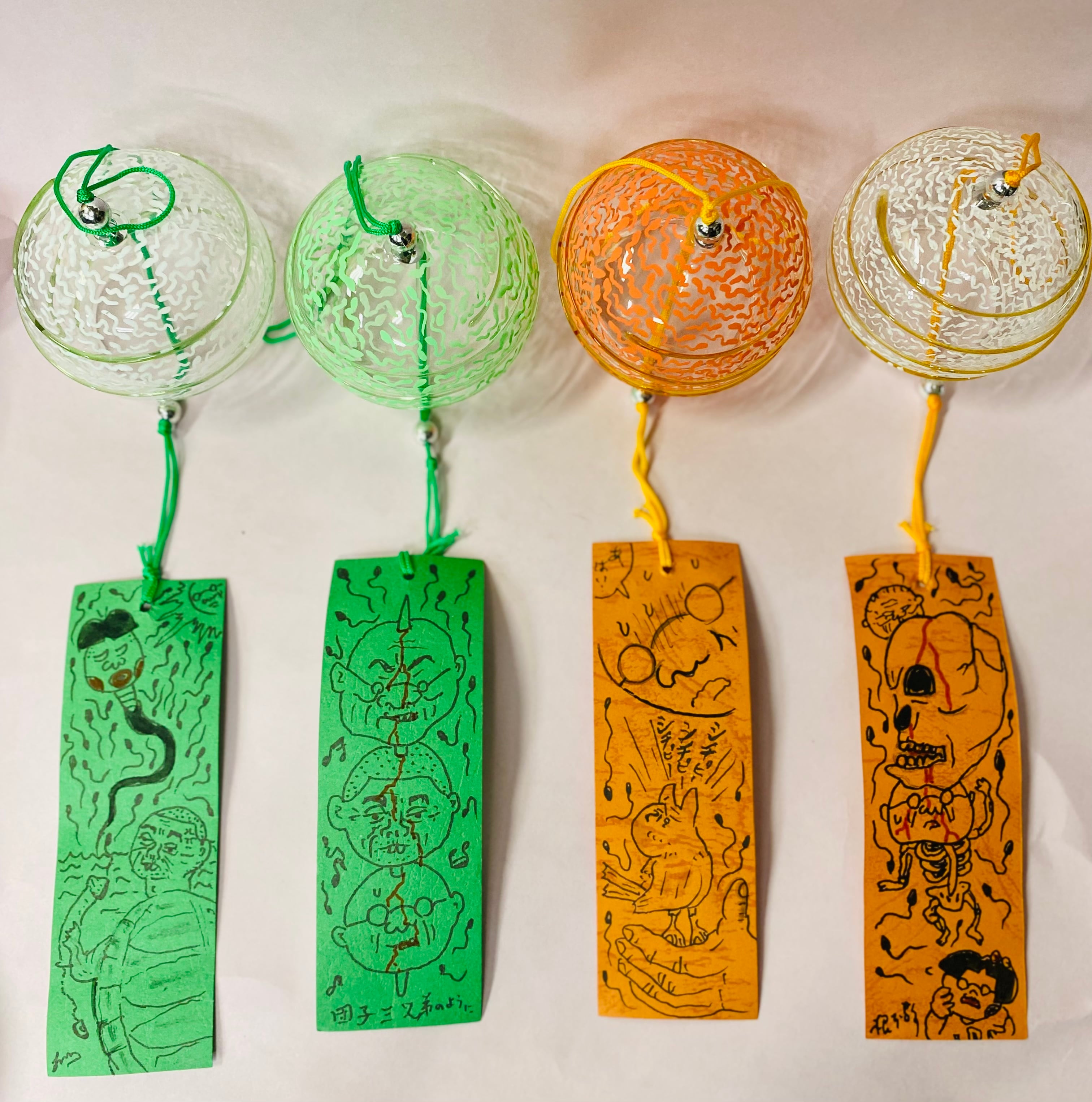 手描き、手塗りの1点もの風鈴です。 ガラス部分にはぎっしりの精子、下の紙には片面イラストと片面文字入り。 「生きろ」 素材 ガラス アクリル紐 紙 アクリル絵の具、ポスカ、定着スプレー サイズ 全長40.5センチ 根本さん直筆のメッセージカードと共にお送りいたします。